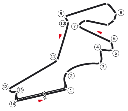 Informationen zur Streckenvariante - Bei der GP-Variante handelt es sich um einen Km langen Rundkurs, welcher in dieser Layout-Variante von 2005 bis 2011 befahren wurde. - Die Streckenvariante stellt eine normal hoch Herausforderung für die Motoren und eine normal hoch Belastung für die Bremsen dar, weshalb der Treibstoffverbrauch normal hoch ausfällt. - Besonderheit dieser Strecke ist die berühmte vierfach Links-Kurve.