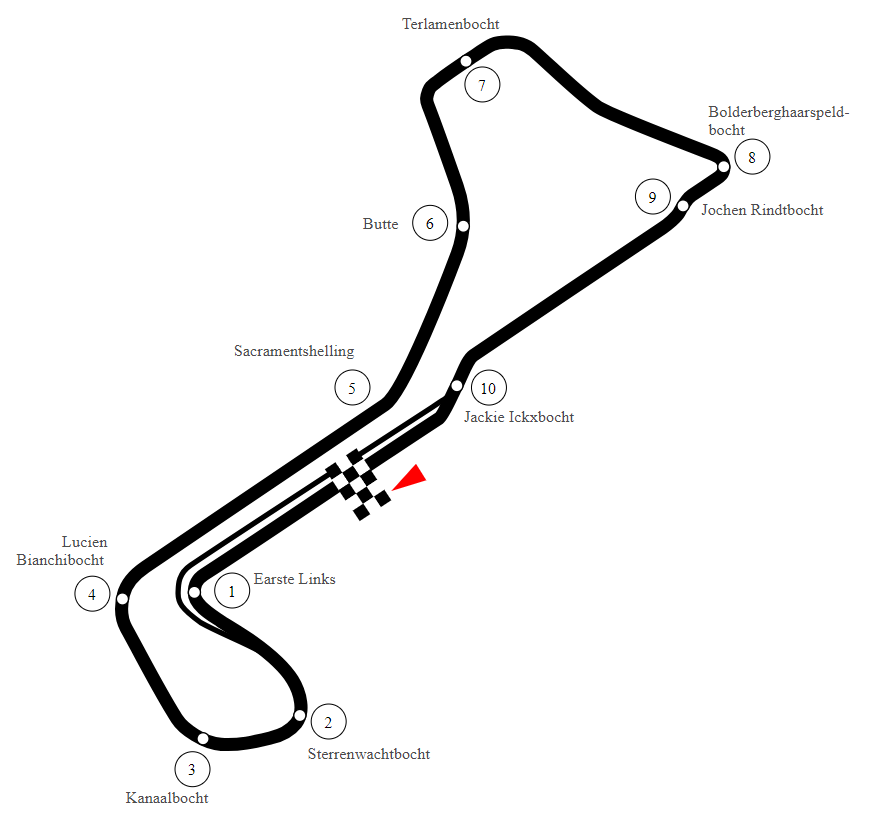Informationen zur Rennstrecke - Der Circuit Zolder wurde als permanente Rennstrecke in Zolder (Land: Belgien, Bundesstaat: Flandern) von Johannes Hugenholtz erbaut, welcher außerdem den 1948 in Zandvoort (Niederlande) eröffneten Circuit Park Zandvoort und den 1962 in Suzuka (Japan) eröffneten Suzuka Intern. Course und den 1967 in Sanse (Spanien) eröffneten Circuito del Jarama entwarf. - Die Rennsport-Anlage wurde im Jahre 1963 eröffnet und befindet sich seither im Besitz des Streckenbetreibers Motorsportclub Zolder. - Meteorologischen Aufzeichnungen zufolge fällt an 220 Tagen jährlich (also 60 % des Jahres) Regen in Zolder. - Die Strecke bringt durch ihren normal rau Asphalt-Belag einen normal hoch Reifenverschleiß mit sich.