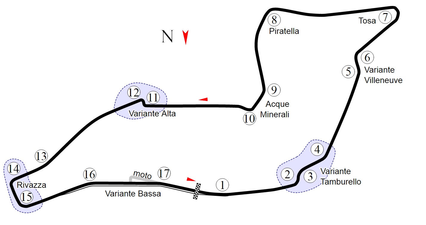 Informationen zur Rennstrecke - Der Autodromo Enzo e Dino Ferrari wurde als permanente Rennstrecke in Imola (Land: Italien, Bundesstaat: Emilia-Romagna) erbaut. - Die Rennsport-Anlage wurde im Jahre 1953 eröffnet und befindet sich seither im Besitz des Streckenbetreibers Dino Ferrari. - Meteorologischen Aufzeichnungen zufolge fällt an 78 Tagen jährlich (also 21 % des Jahres) Regen in Imola. - Die Strecke bringt durch ihren rauer Asphalt-Belag einen erhöht Reifenverschleiß mit sich.