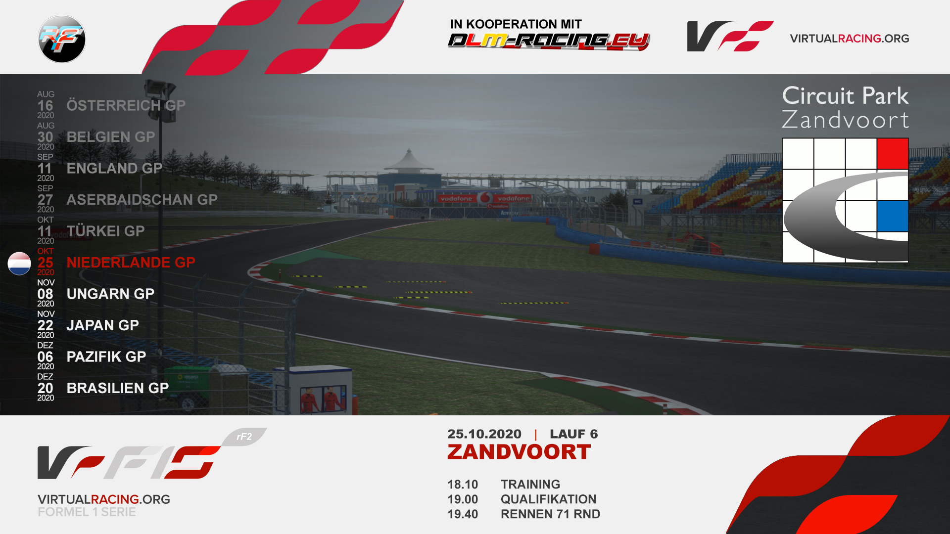 Spannender Rennverlauf, zahlreiche packende Positionskämpfe Formel-DLM 06. Niederlande GP - Stream Rennen [inkl. Quali, Interview] 25.10.2020 | Formel-DLM | Stream | Vom System erstellt Das Rennen [inkl. Quali, Interview] zum Großen Preis von Niederlande der Formel-DLM Saison 2020HW in Zandvoort vom Sonntag, den 25. Oktober 2020