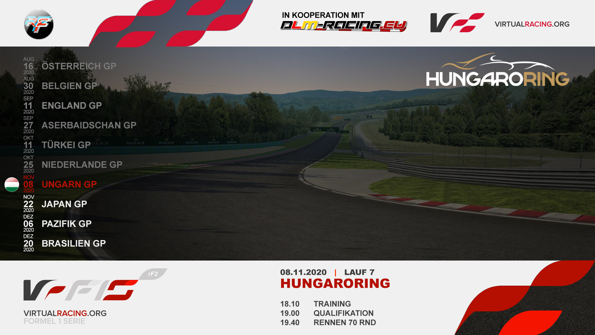 Budapest - Hungaroring (GP) Formel-DLM Saison 2020HW - 07. Großer Preis von Ungarn 28.10.2020 | Formel-DLM | Rennvorschau | Vom System erstellt Am Sonntag, den 08. November 2020 [KW45] findet in der Landeshauptstadt Budapest (Budapest, Ungarn) mit dem Großer Preis von Ungarn, 240 Meter über dem Meerespiegel, das mit Vorfreude erwartete 7. Rennen der Formel-DLM Saison 2020HW statt. Auf dem 1986 eröffneten von István Papp erbauten 4,381 Km langen permanenten Rundkurs Hungaroring ist im Rennen auf der GP-Variante eine Distanz von 70 Runden zu absolvieren, was einer Gesamtstrecke von 306,670 Km entspricht. Bei seinem insgesamt 220. Renntag in seiner inzwischen 24. Saison gastiert die Formel-DLM zum insgesamt 10. mal auf dieser Rennstrecke. Der überwiegend Ungarisch sprachige etwa 10 Millionen Einwohner beheimatende fast 93 Tausend Km2 große Binnenstaat mit seiner Bevölkerungsdichte von 108 Einwohnern pro km2 liegt im Osten in den kühlgemäßigte Zone Europas. Ausgetragen werden die Sessions im 'Land am pannonischen Becken' am Tag bei live simuliertem Wetter. An 78 Tagen im Jahr fällt in dieser Region Niederschlag, weshalb das allgemeine Regenrisiko etwa bei 21 % liegt. Die Übertragung im Live-Stream beginnt ab 18:55 Uhr und endet voraussichtlich um ca. 22:10 Uhr, kommentiert von Michael Merkers.